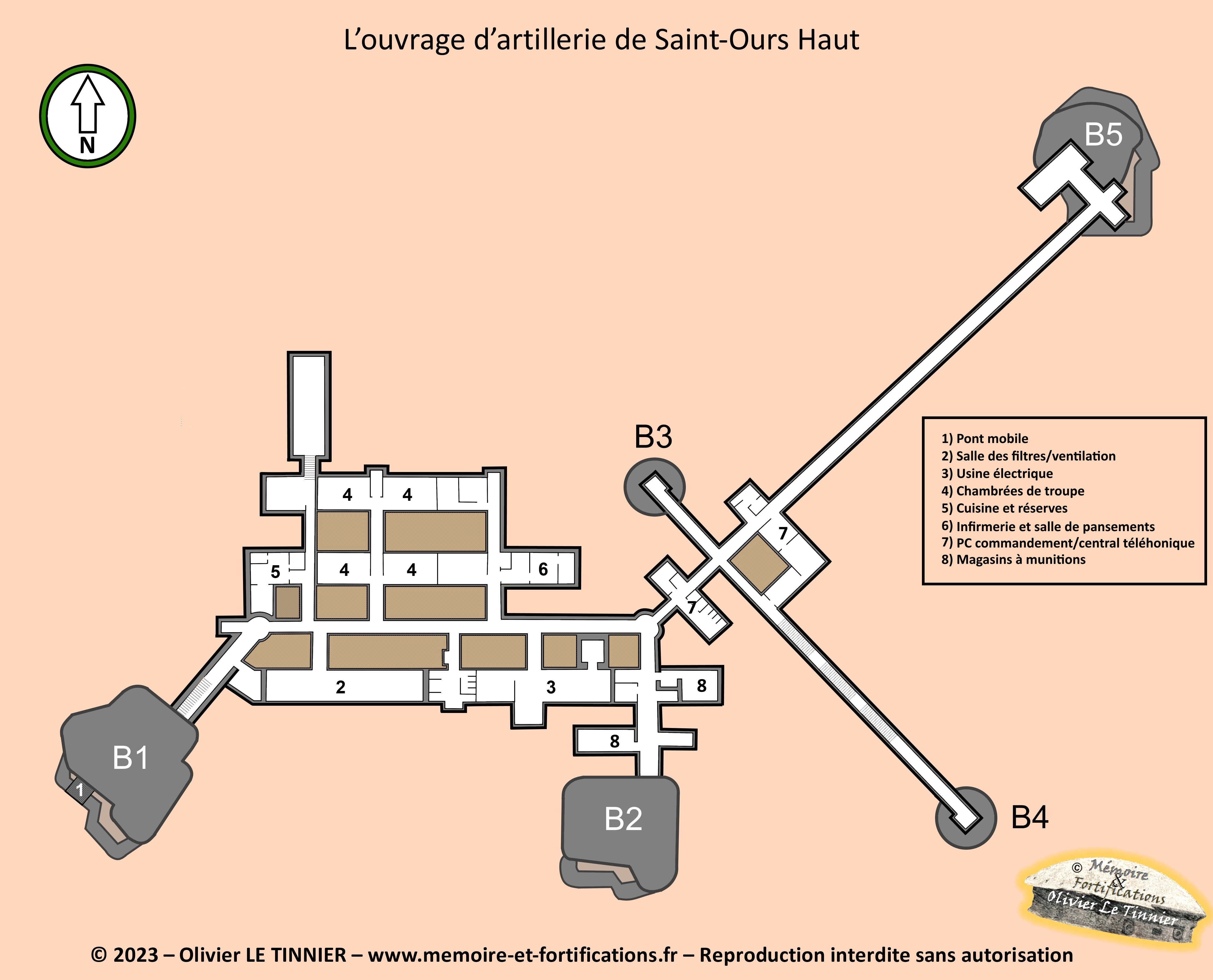 Carte du secteur avec des différents ouvrages | L’ouvrage de Saint-Ours Haut est un ouvrage d’artillerie situé dans la vallée de l’Ubayette, affluent de l’Ubaye. Situé à l’altitude de1885m, sa mission est de verrouiller la route venant d’Italie par le col de Larche. Les mortiers de 50 des Blocs 2 et 5 assurent le flanquement de la partie Sud de l’ouvrage de Roche la Croix situé en face a 1,7 km. Il se compose de 5 blocs : 1 d’entrée, 2 de combat et 2 d’observation, pour un effectif de 11 officiers et 233 hommes. La manœuvre du pont de l'entrée Bloc 1 en vidéo cliquez Envisagé dès 1929, le projet de construction de l’ouvrage évolue à plusieurs reprises. De nombreuses difficultés et retards émaillent le chantier, notamment par la nature du terrain, de mauvaise qualité, avec de nombreuses failles, de la roche friable qui nécessite d’importants travaux supplémentaires, avec le coulage de béton pour renforcer les galeries dès leur creusement. Les travaux débutent donc à l’automne 1930 et s’étalent jusqu’à l’été 1934 pour le gros œuvre. Le reste des travaux s’étalent jusque fin 1938, une partie des budgets ayant été reportés vers notamment le secteur des ouvrages de Restefond, très en retard sur leurs calendriers de construction. Les choses sérieuses débutent dans le secteur à partir du 17 juin avec une patrouille italienne ayant franchi la frontière par le col de Larche. Cette patrouille rebrousse chemin après que l’ouvrage de Roche la Croix ait ouvert le feu. Les jours suivant le harcèlement italien se poursuit, Roche la Croix intervient à de nombreuses reprises guidé notamment par l'observatoire situé au niveau de l'ouvrage de Viraysse (ouvrage Séré de Rivières construit en 1885) qui a des vues plongeantes sur les différentes routes et chemins venant d'Italie. Du 17 au 24 juin la tourelle de 75 mod. 1931 tirera près de 1900 coups sur les différentes troupes italiennes tentant de s’infiltrer. Pour ce qui est de l’ouvrage de Saint-Ours Haut les tirs seront concentrés sur la journée du 24 juin 1940. |