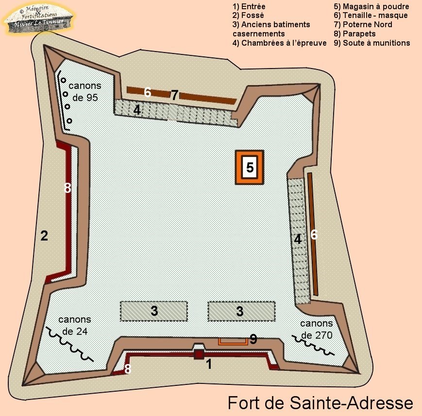 Le projet de janvier 1844 prévoit une véritable ceinture fortifiée autour du Havre. Sainte-Adresse (prévu pour 300 hommes) en est l’extrémité Ouest, puis une série de forts et redoutes reliés par une enceinte fermée rejoint l’océan au Sud de la zone portuaire. Ce projet provoque un tollé. Il est même prévu 3 forts en mer ( !)