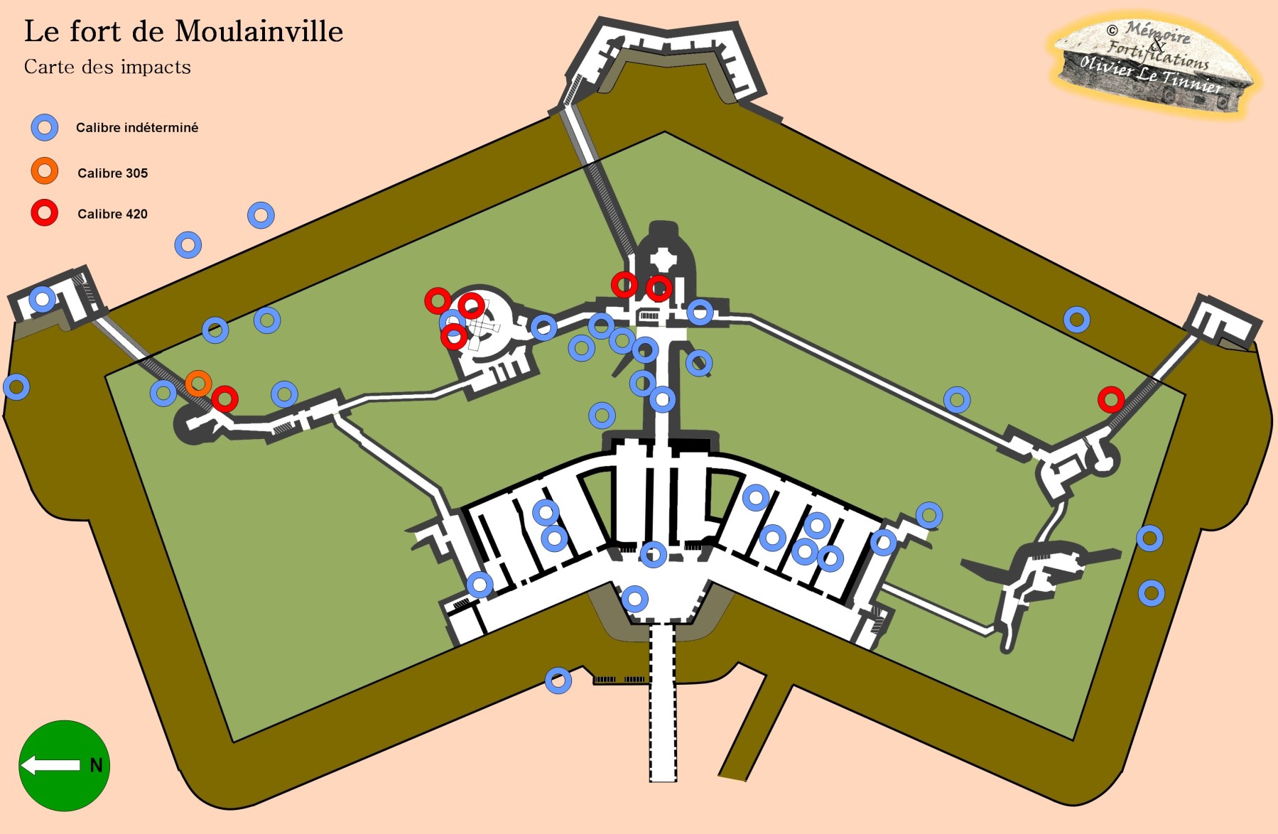 Le fort de Moulainville fut ainsi visé du 26 février au 20 septembre 1916 par environ 330 obus de 420 mm (43 au but), 770 de 305 mm, 280 mm ou 210 mm allongés, 4 700 obus de 210 mm courts, 150 mm ou 130 mm, 2 600 obus de 105 mm et 1 100 obus de 77 mm, soit un obus par trois m², ce qui a bouleversé totalement les dessus et les fossés du fort.